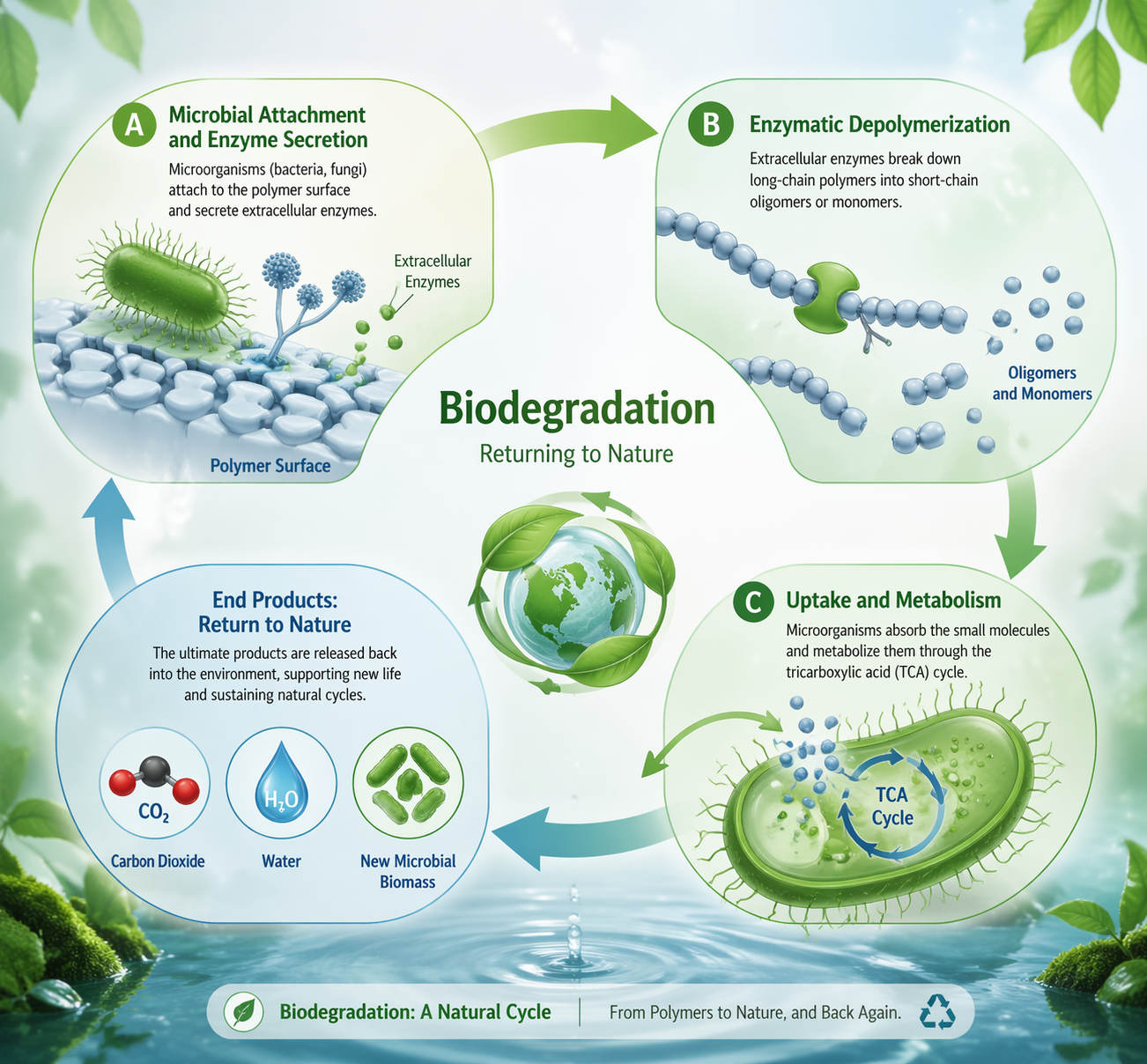 Il processo di degradazione inizia con la secrezione di enzimi extracellulari da parte dei microrganismi. Poiché le molecole polimeriche sono in genere troppo grandi per passare attraverso le pareti cellulari microbiche, devono prima essere depolimerizzate in frammenti più piccoli: oligomeri e monomeri. Enzimi come lipasi e proteinasi prendono di mira specifici legami chimici, come i legami esterei o ammidici, scomponendoli in componenti più piccoli e solubili. Una volta che queste unità raggiungono un peso molecolare sufficientemente basso, vengono trasportate nella cellula, dove entrano nelle vie metaboliche, come il ciclo dell'acido citrico, per essere infine convertite in energia e elementi costitutivi per nuove cellule.